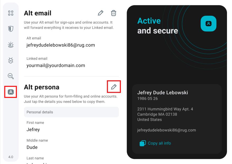 1. Open the Surfshark browser extension,  click on the Alternative ID tab, and click on the pencil icon next to the Alt persona.