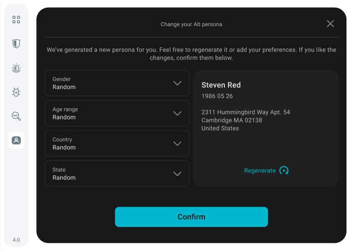 2. In the next window, you will be introduced to your alternative email. You can either keep the generated one or regenerate a different one. Once you are happy with your Alt email, click Confirm.