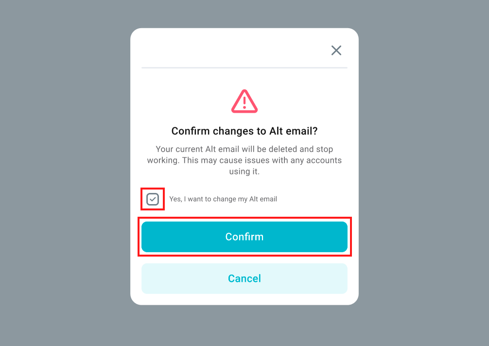 3. Tick the box Yes, I want to change my Alt email and click Confirm.