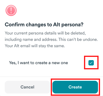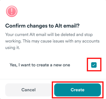 3. If you have Regenerated the Alt email, you will get a confirmation box. Tick Yes, I want to create a new one and click Create.