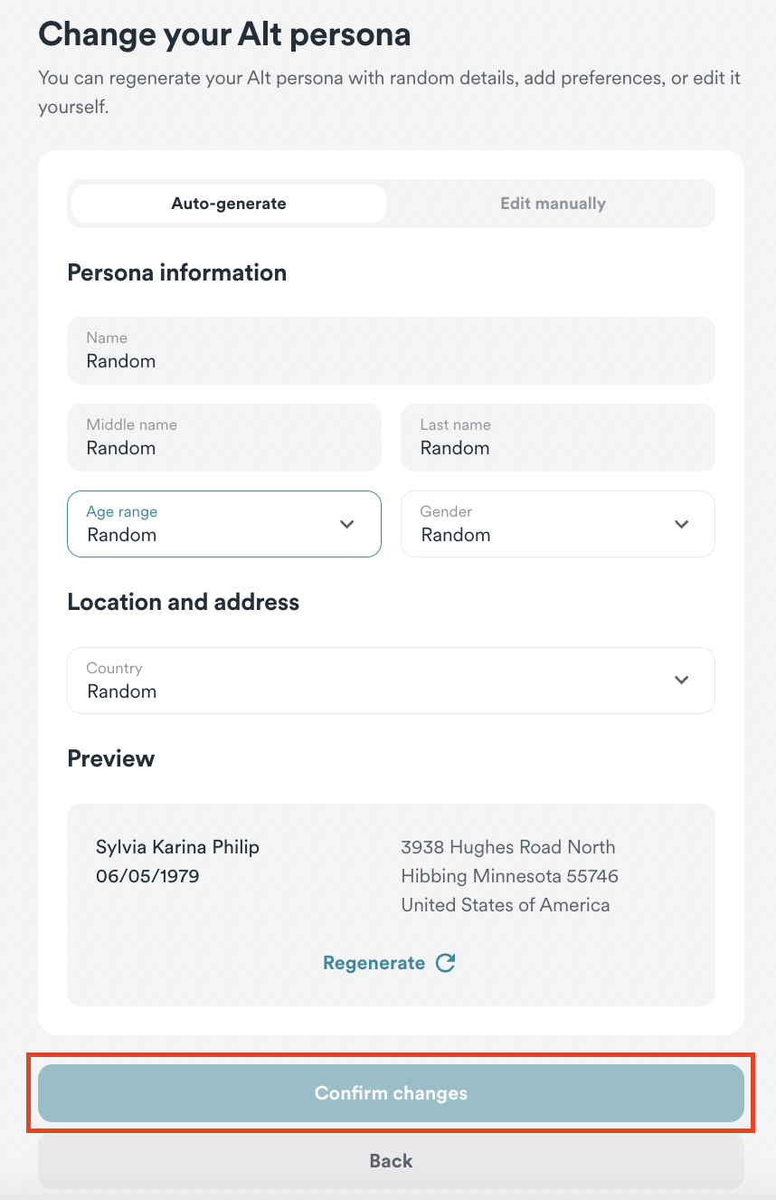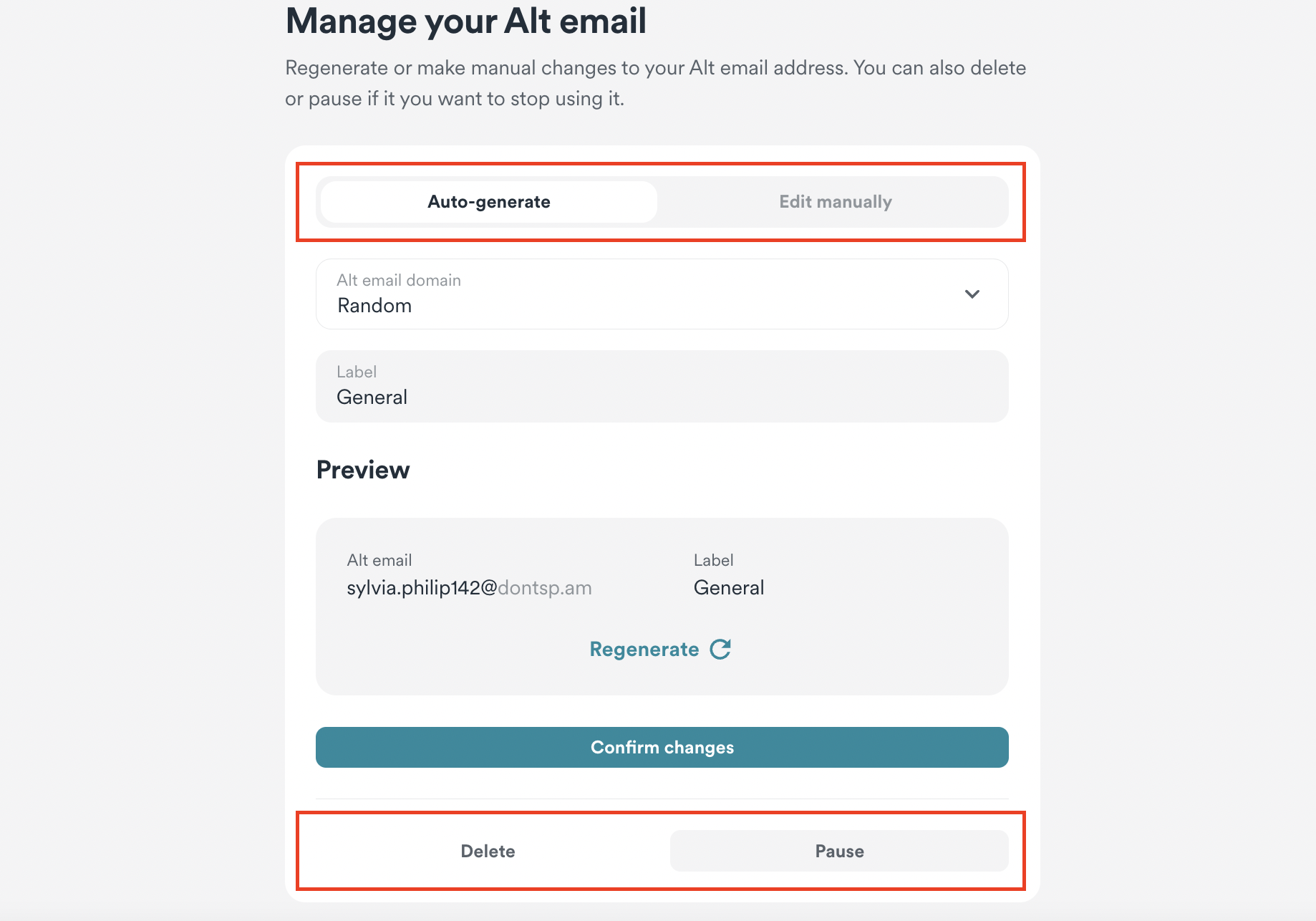 2. Here, you can either keep the generated one or regenerate a different one. You can customize your Alt email's generation by selecting Edit manually.