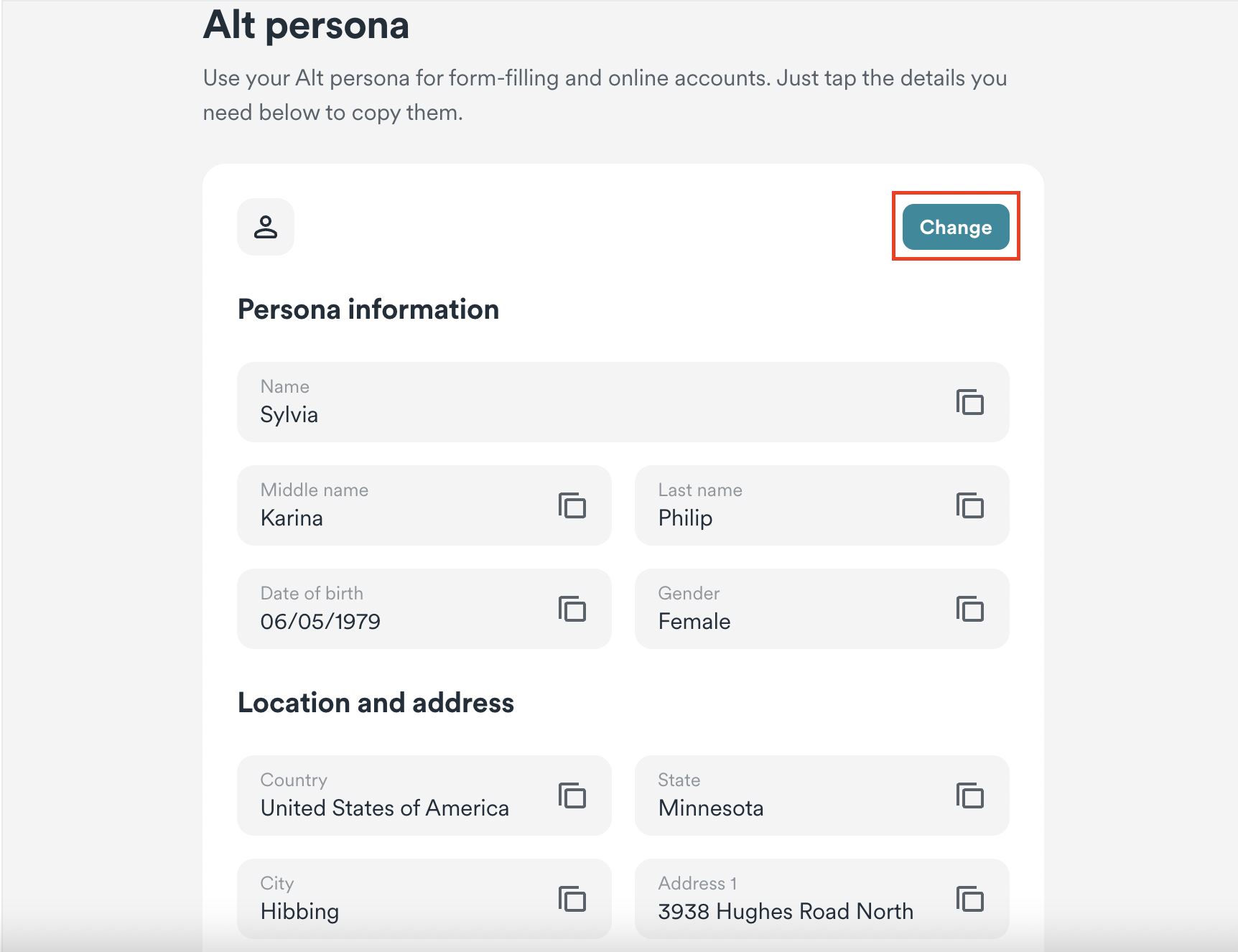 1. In your Surfshark account, go to the Alternative ID tab, scroll down, and click Change next to Alt persona.