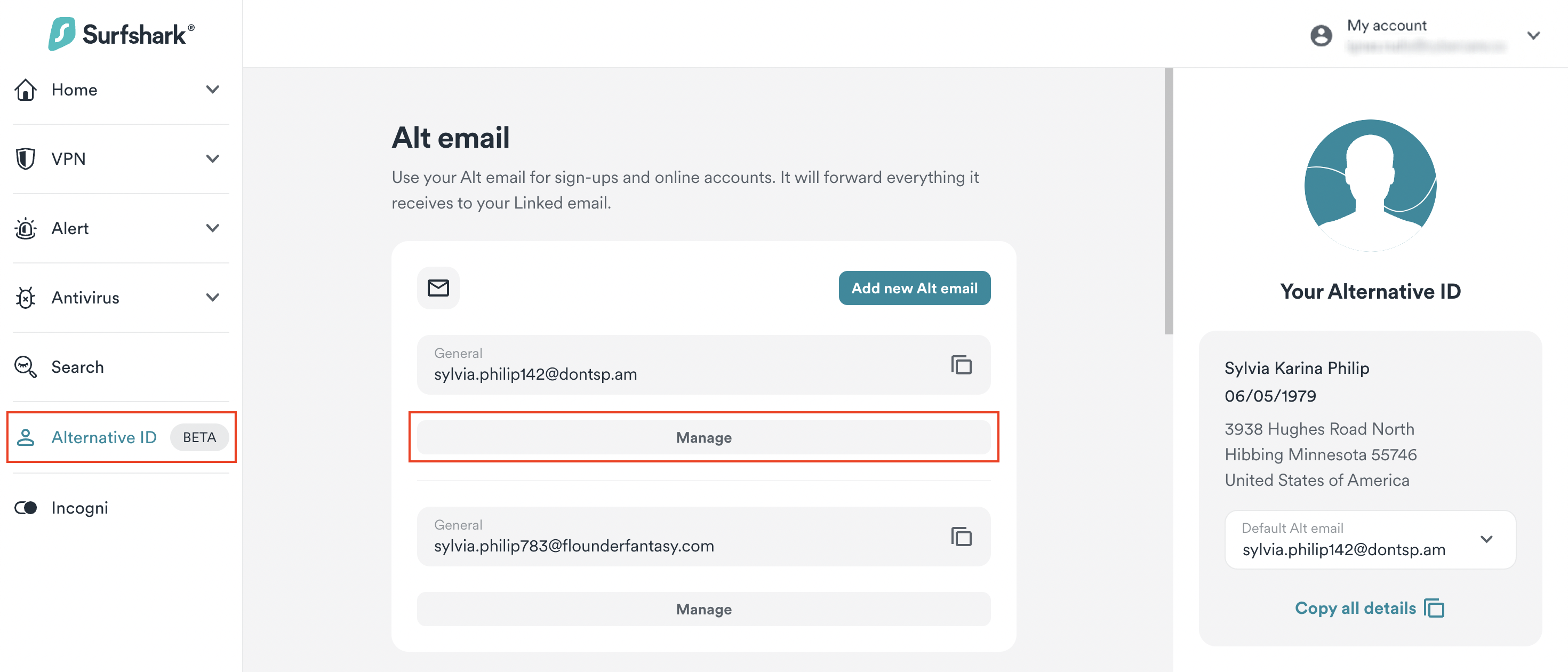 1. Log into your account through the Surfshark login page. Then, go to  the Alternative ID tab, and click Manage under Alt email.