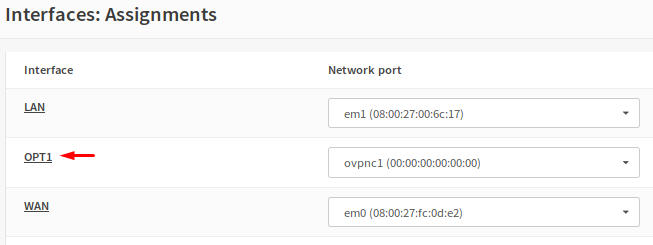 7. Navigate to Interfaces > Assignments and click on + near New Interface. By default, it should be ovpnc1.
