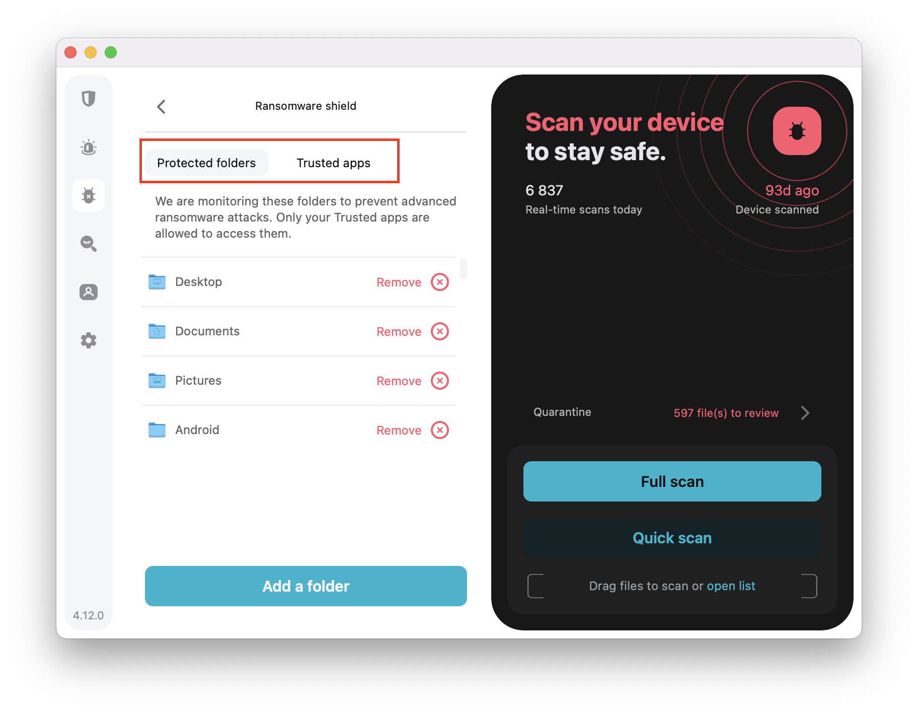It will protect you from malicious attacks on your device, which try to encrypt your files and ask for payment to decrypt them. Ransomware shield works by monitoring your selected folders that applications try to access to interact with files.