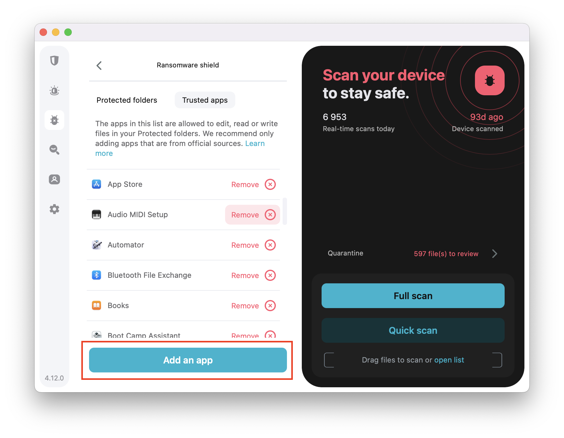You can also remove folders or apps by clicking Remove or add new ones by pressing Add a folder or Add an app. Once you do, the app or folder will be under Ransomware Shield's protection.