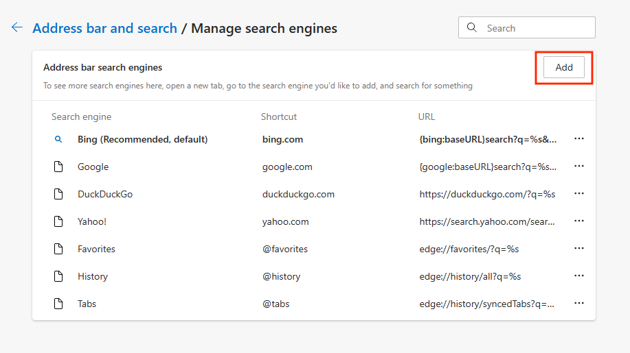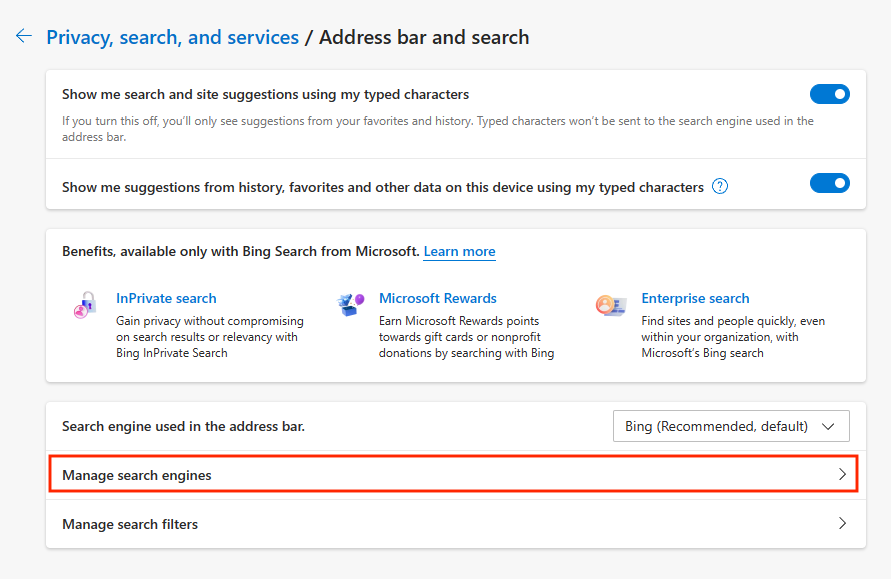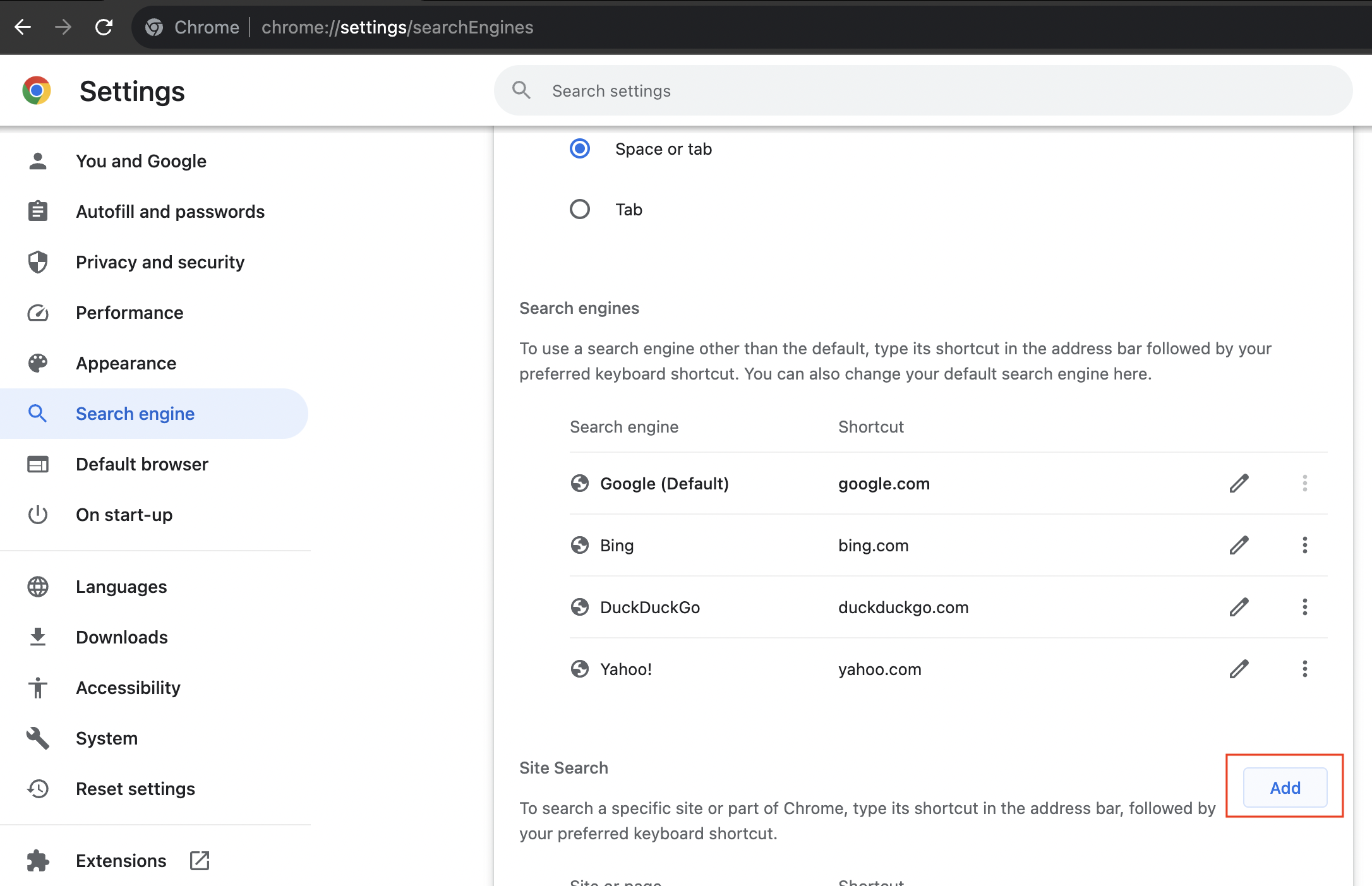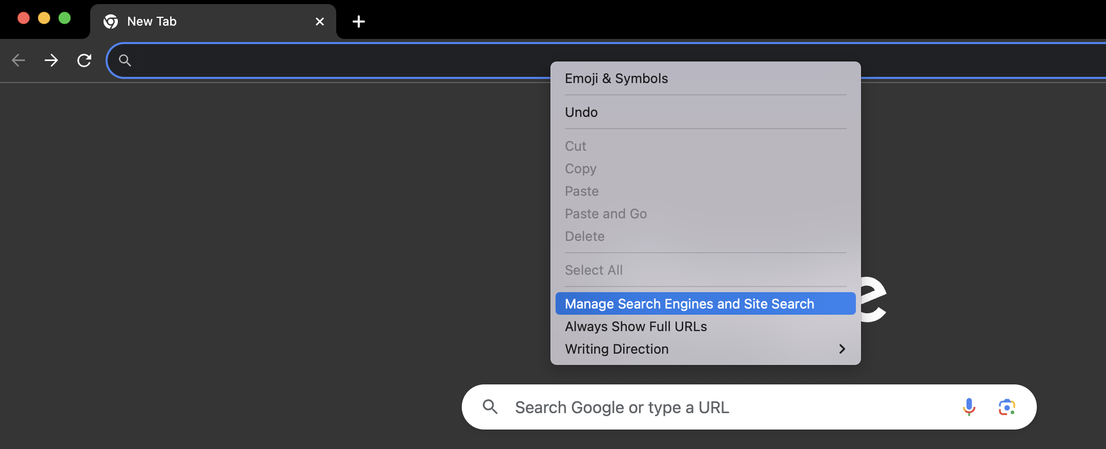 1. Right-click in the address bar, and select Manage search engines and Site Search.