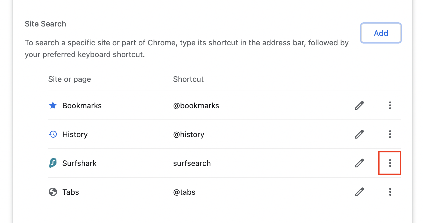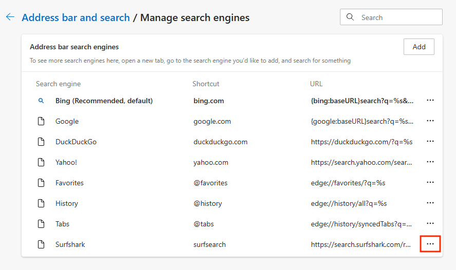 8. Now, you'll be able to see Surfshark in the available search engine list. Click the three dots next to the Surfshark listing.