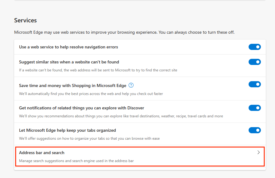 4. In the list that appears, scroll down and look for Services. There, click on Address bar and search.