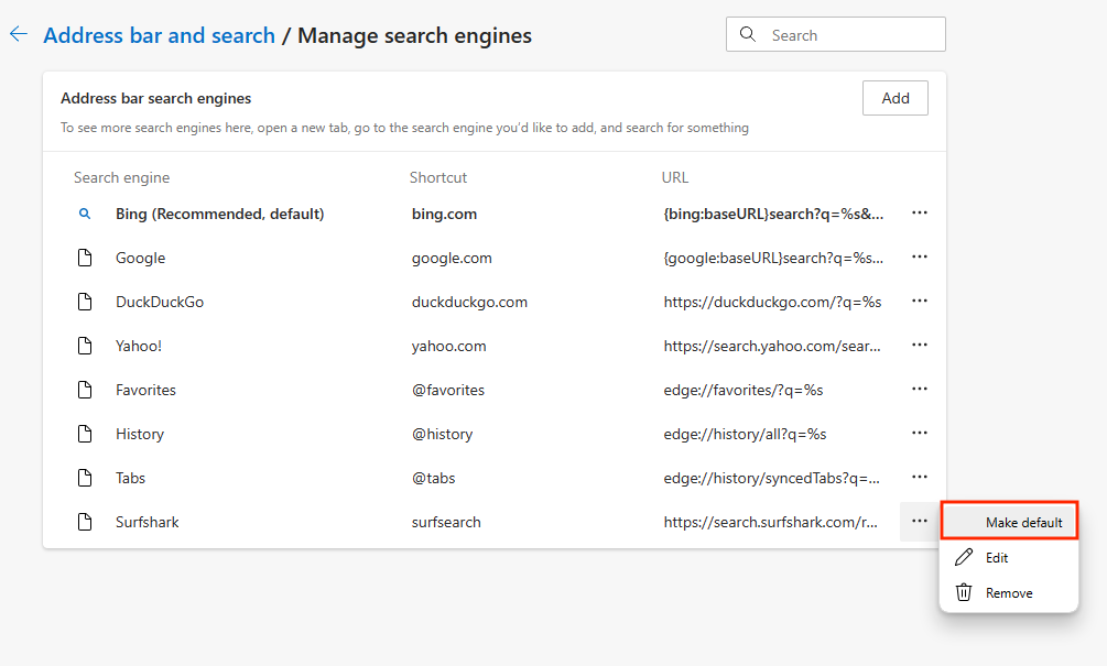 5. Click on Make default, and that's it – Search is now your default search engine.