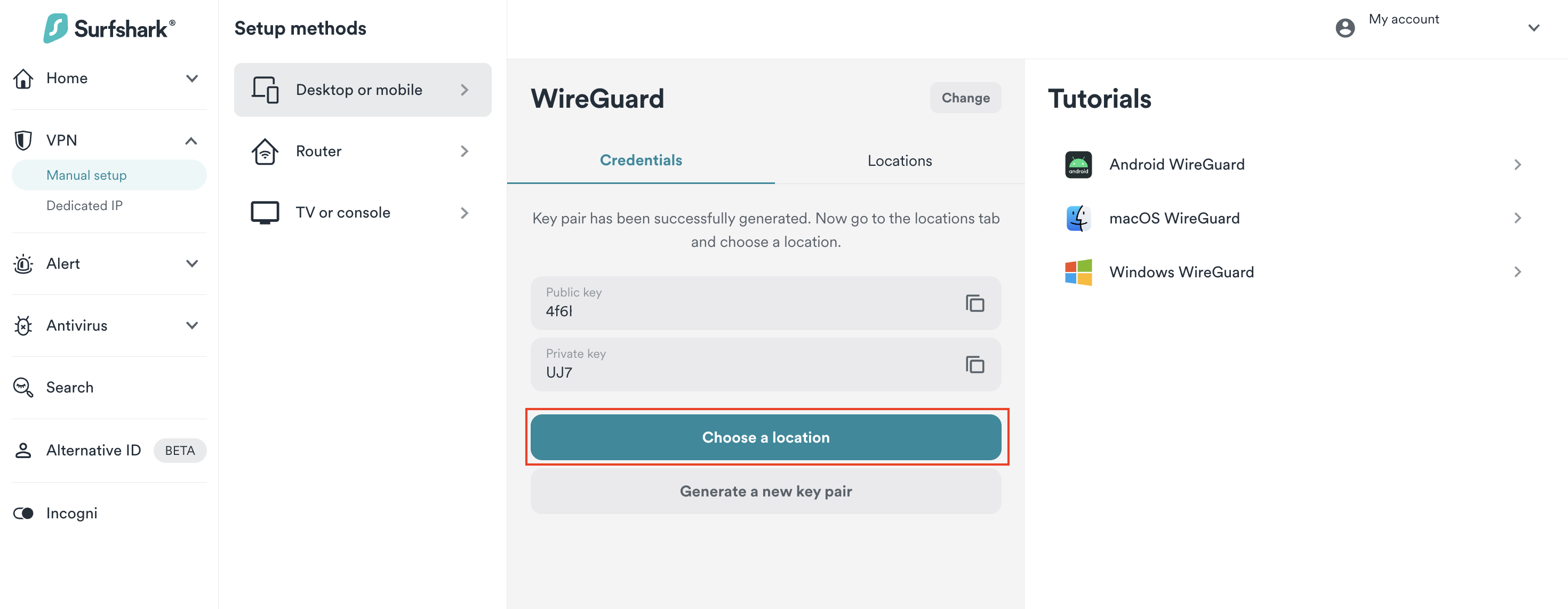 Once you have your key pair, you should see a Choose a location button. Click on it. Here, you'll find the list of available locations to connect to. Select one and keep this window open, as we'll need it for later.