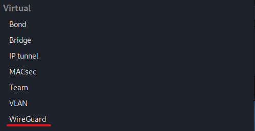 4. In the following window, select the connection type. In the dropdown menu, choose WireGuard under the Virtual tab.