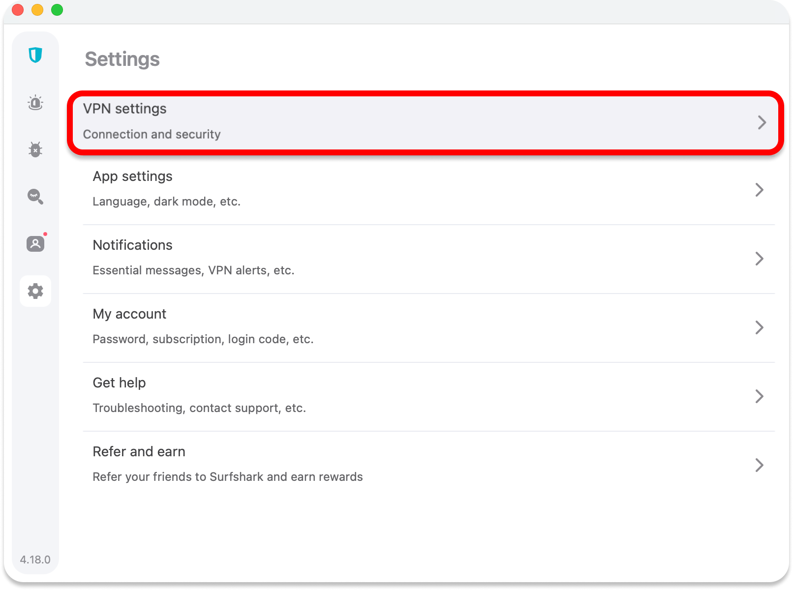 1. Open the Surfshark application. On the left-hand side panel, click Settings.