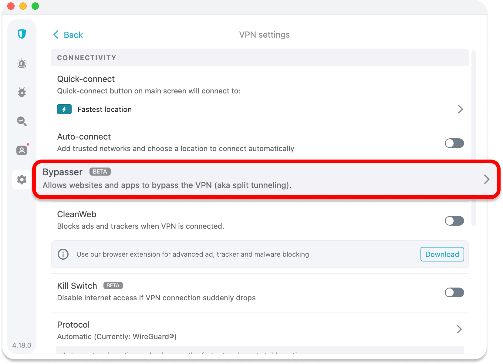 In this article, you will learn the basics of the newly introduced Bypasser feature on macOS. Bypasser is a feature that allows specific apps & websites to be routed via the VPN tunnel.