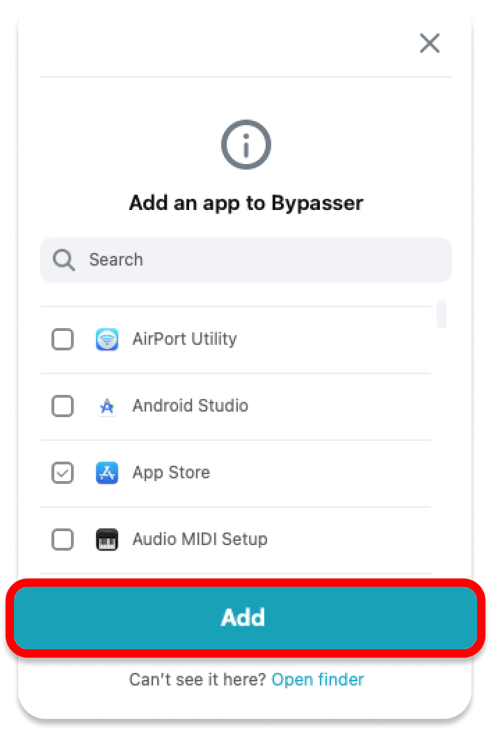 2. You will see a list of all applications visible on your device. To add the app(s) to Bypass VPN, leave a checkmark next to them. Once you're done, press Add.
