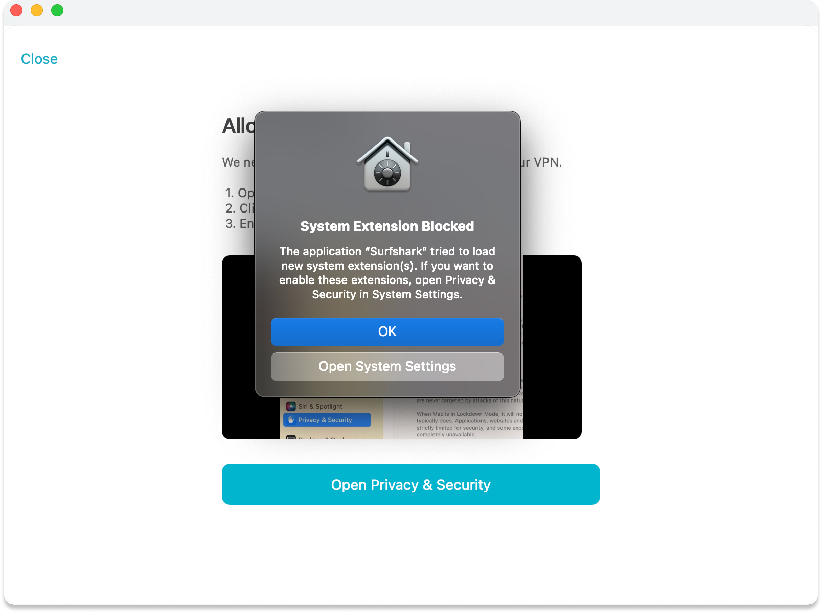 3. Please note that when using the Bypasser for the first time, you'll have to Allow the Surfshark system extension via System Settings.