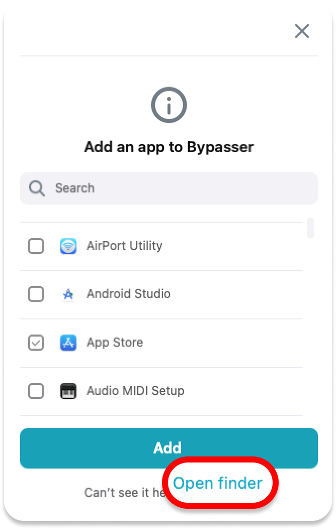 4. If you can't find the application on this list, click Open finder and locate the app.