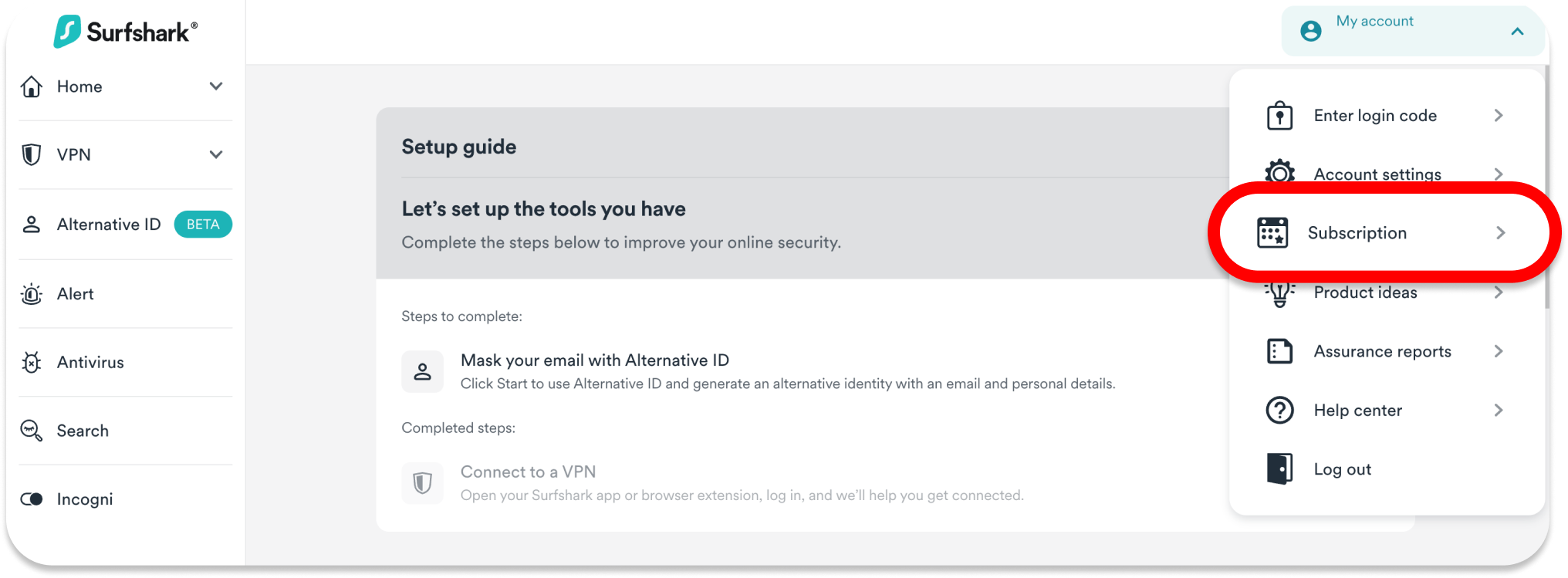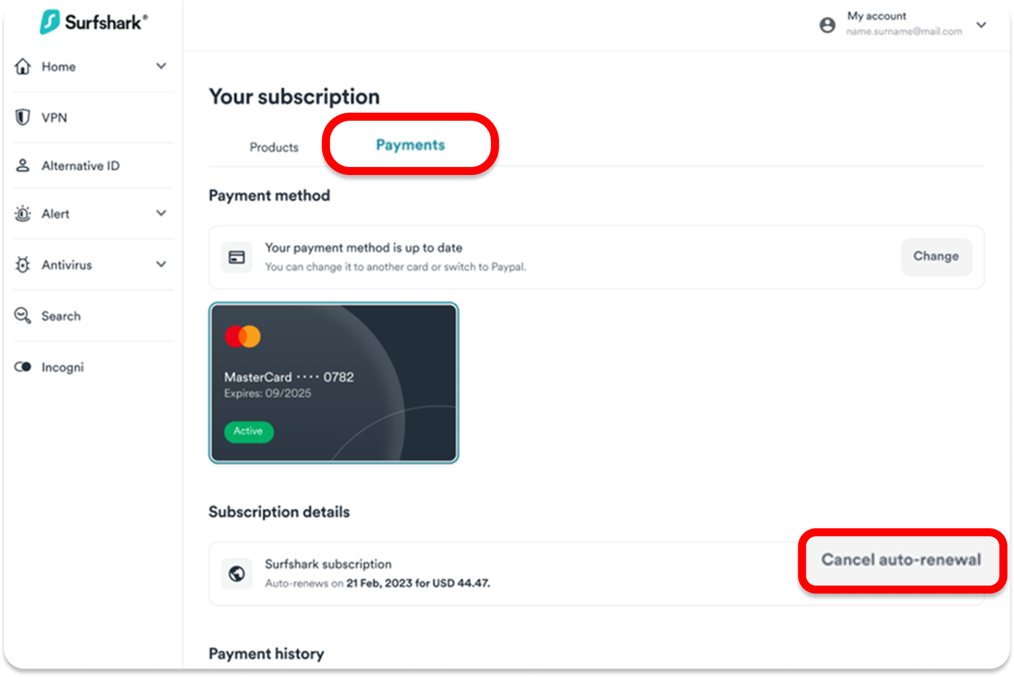 NOTE: Cancelling your subscription's auto-renewal does not automatically grant a refund – it stops your subscription's auto-renewal and recurring payments. If you purchased our services within the last 30 days and wish to receive a refund, please refer to our article on Surfshark refund policy.