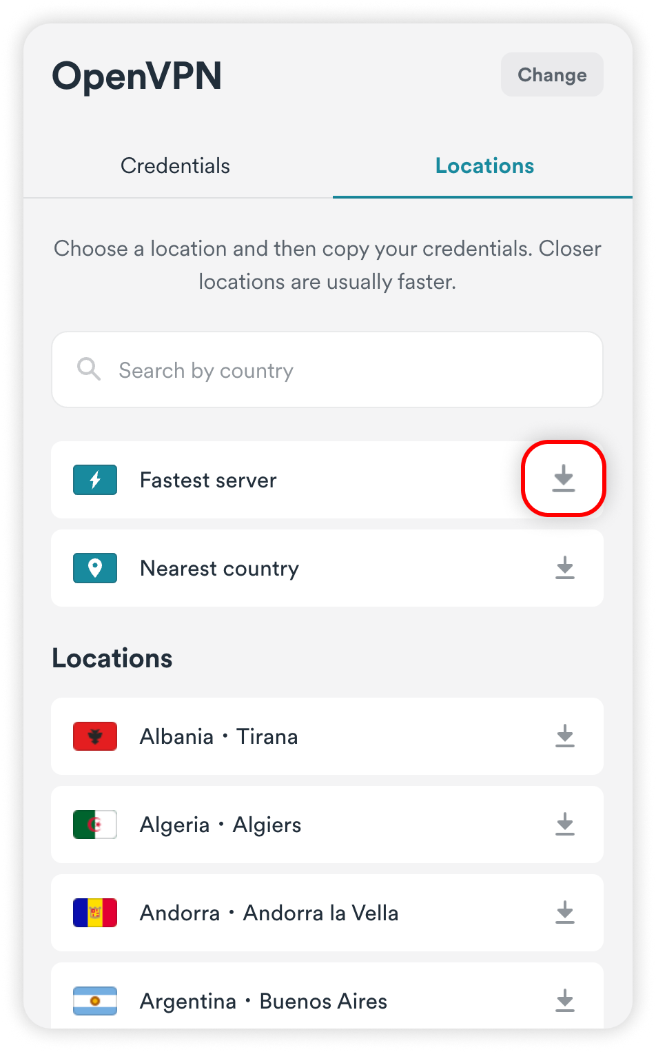 2. Click on the download icon to the right of the server name.