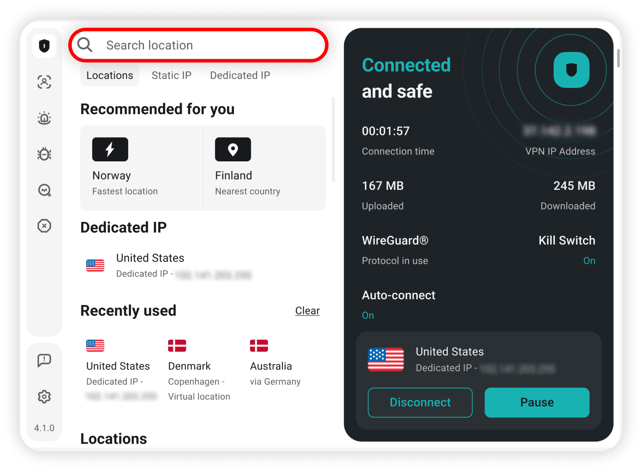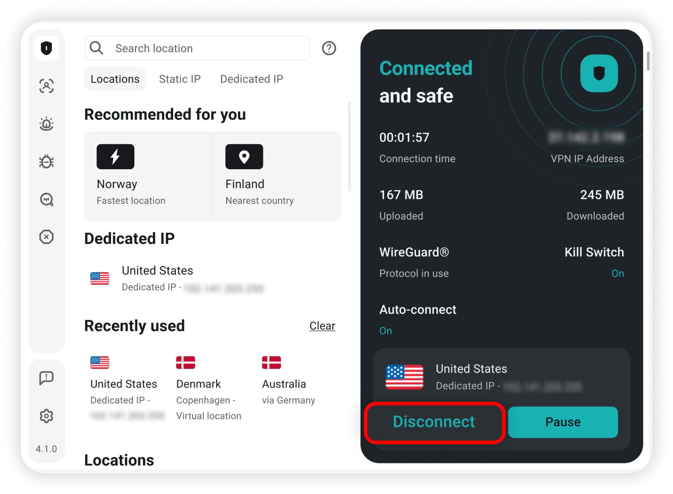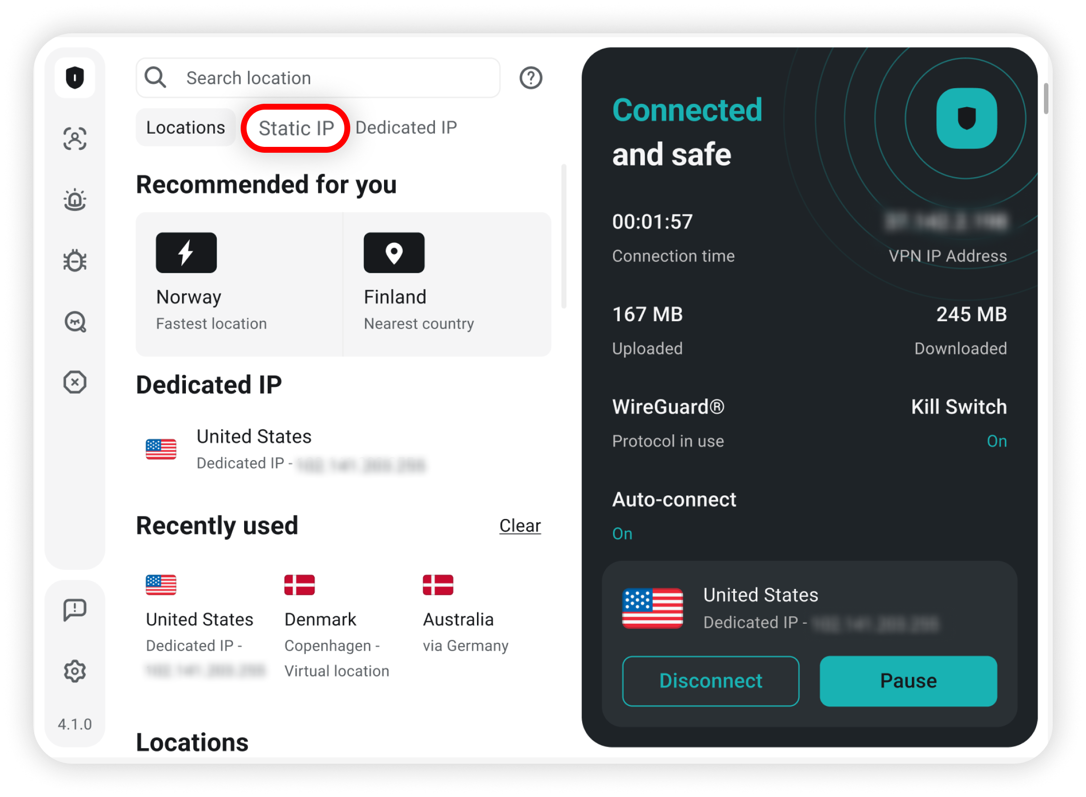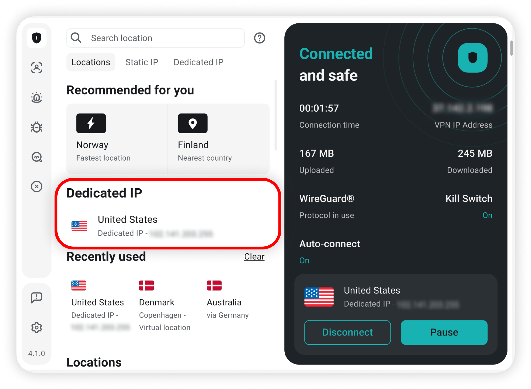 Alternatively, you can navigate to the Dedicated IP tab and connect to the Dedicated IP from there: