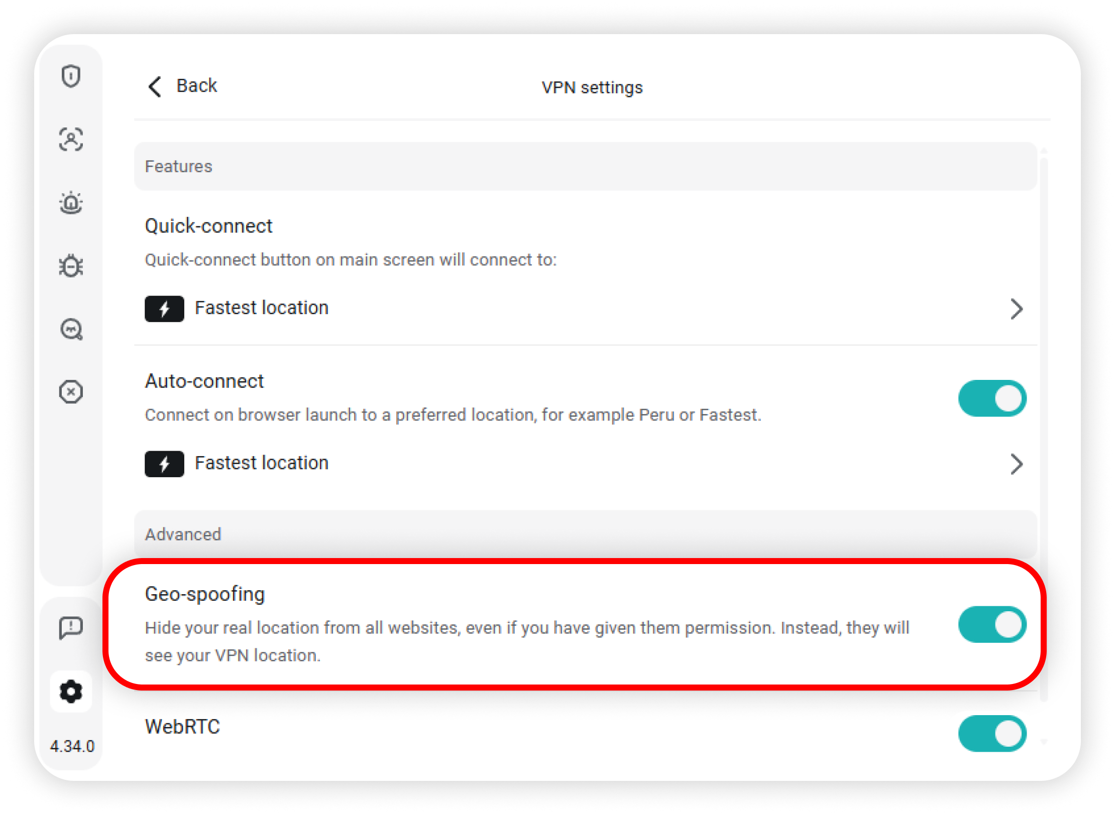 Toggle the WebRTC feature, which prevents websites from using WebRTC to discover your IP and location: