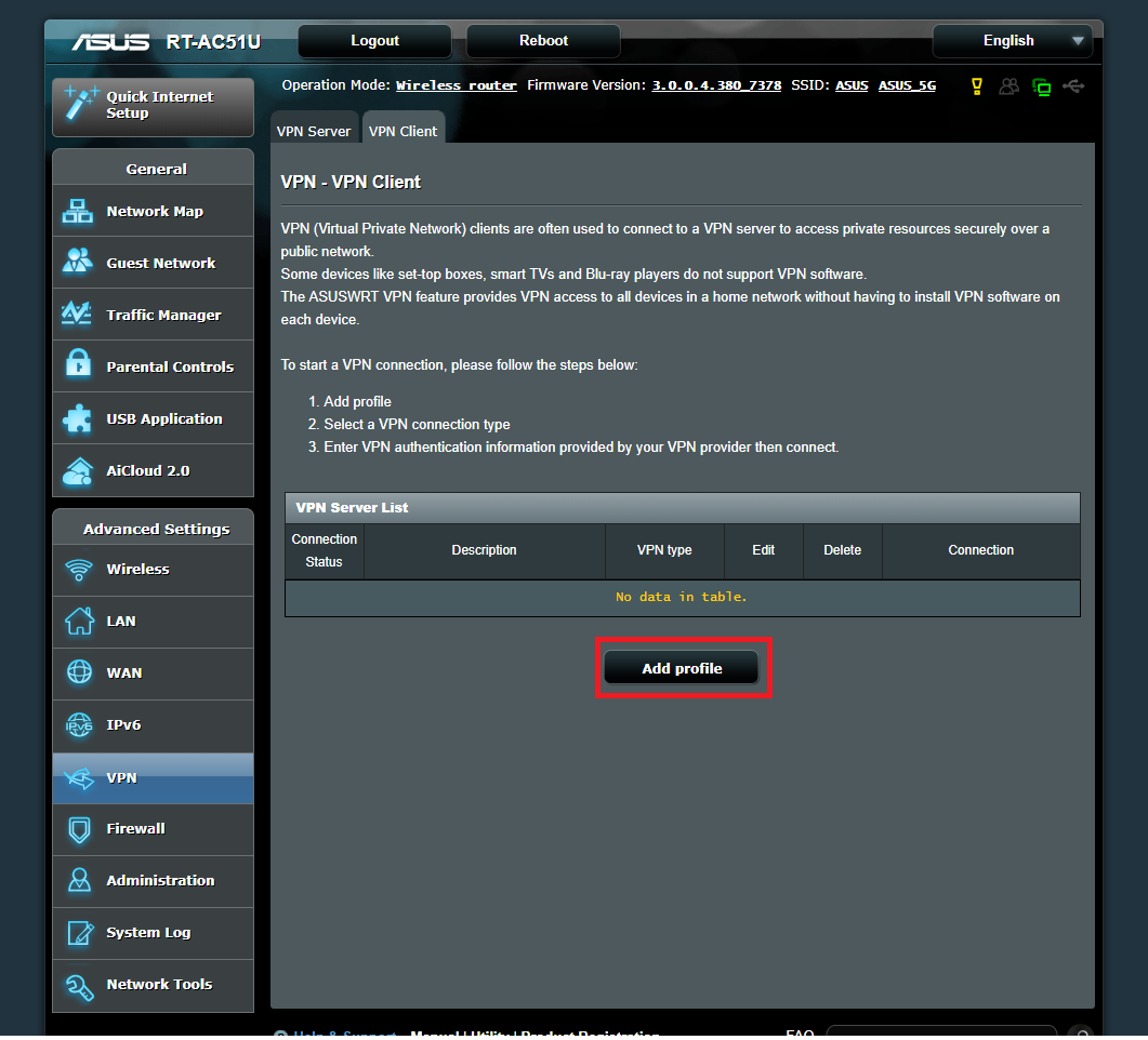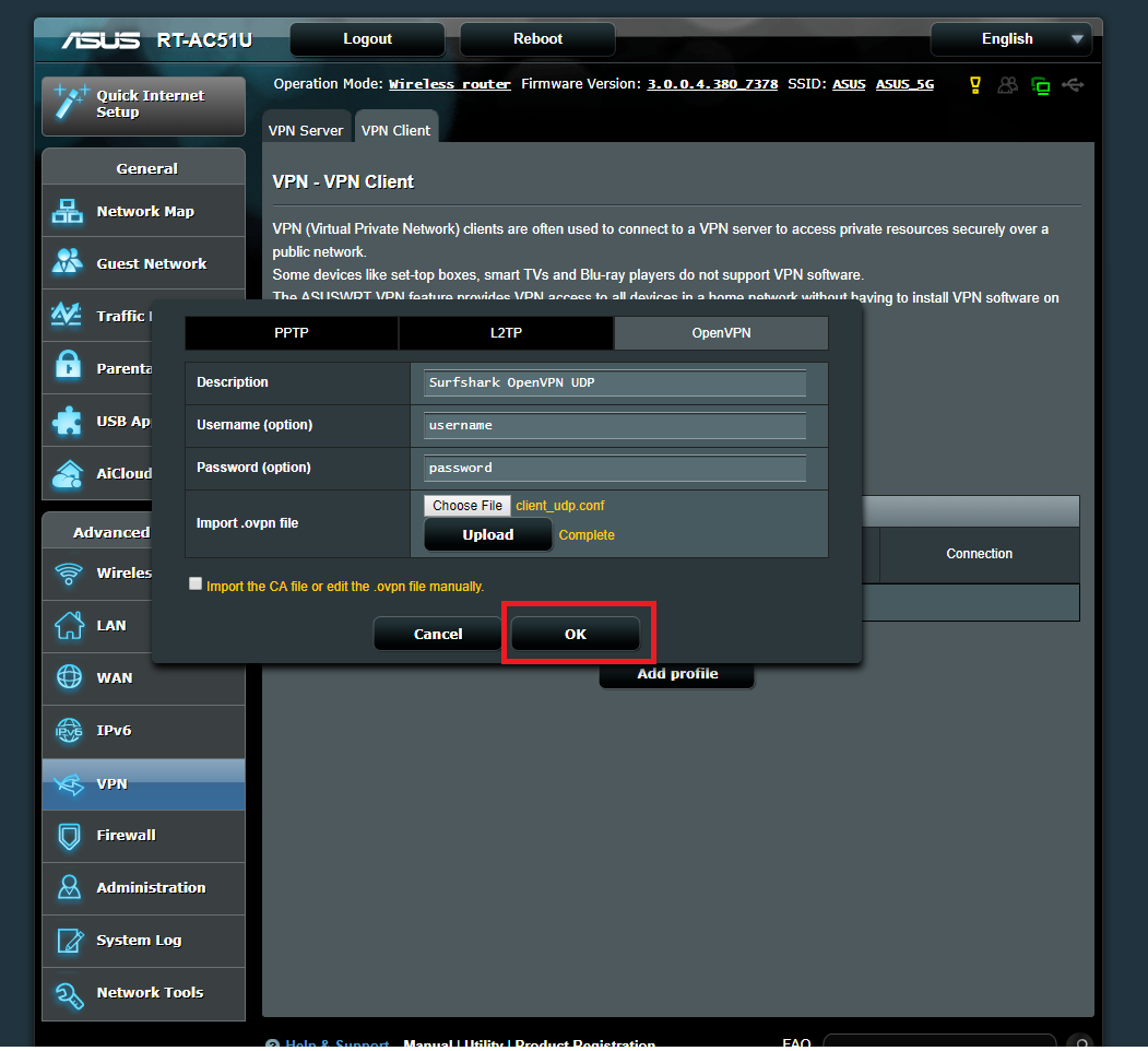 NOTE: If you have updated your Asus router's firmware and have VPN Fusion instead of VPN Client available, set up OpenVPN on Asus VPN Fusion or set up WireGuard on Asus VPN Fusion.