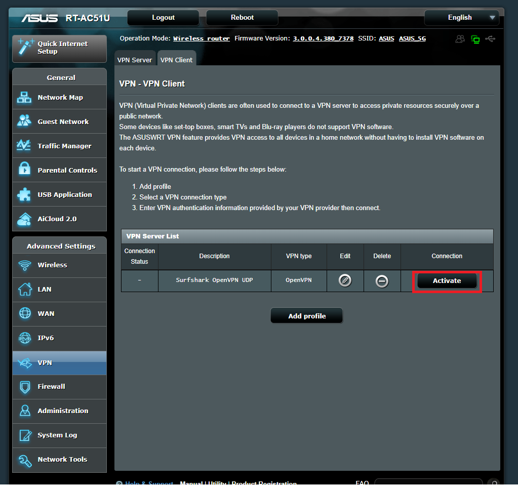 11. You should see a new connection set up. Click on the Activate button to connect your router to a Surfshark server.