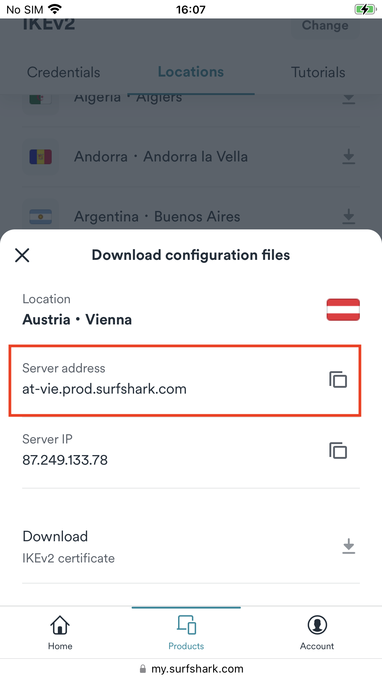 Scroll down to the bottom of the Locations tab. Tap on the IKEv2 certificate to start the download.
