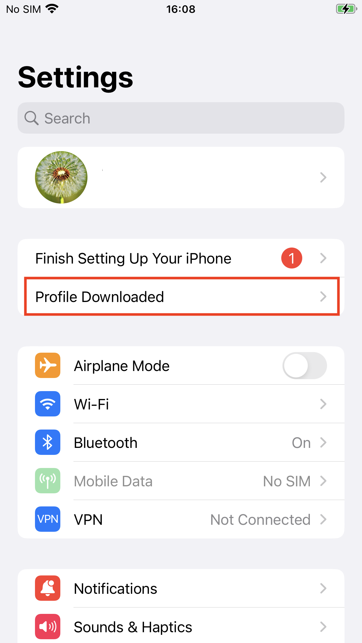 - Open the Settings app. You will notice a tab saying Profile Downloaded. Tap on it.