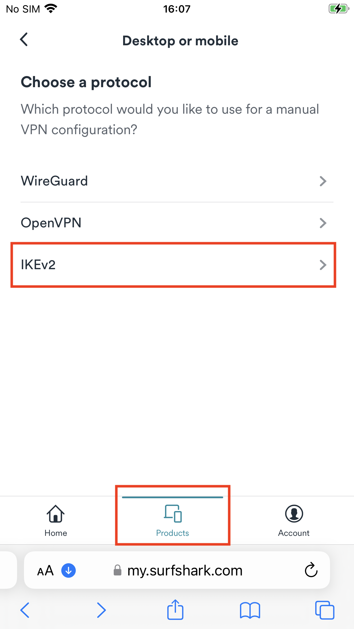 Enter the Surfshark login page and log in. Then, click on Products > VPN > Manual Setup > Desktop or mobile > IKEv2 to generate your credentials.
