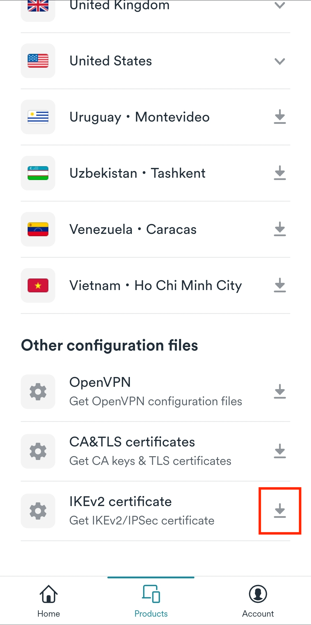 2. Scroll down until you see the IKEv2 certificate under Other configuration files. Tap on the arrow-down logo on the right of the IKEv2 certificate to download the certificate file.