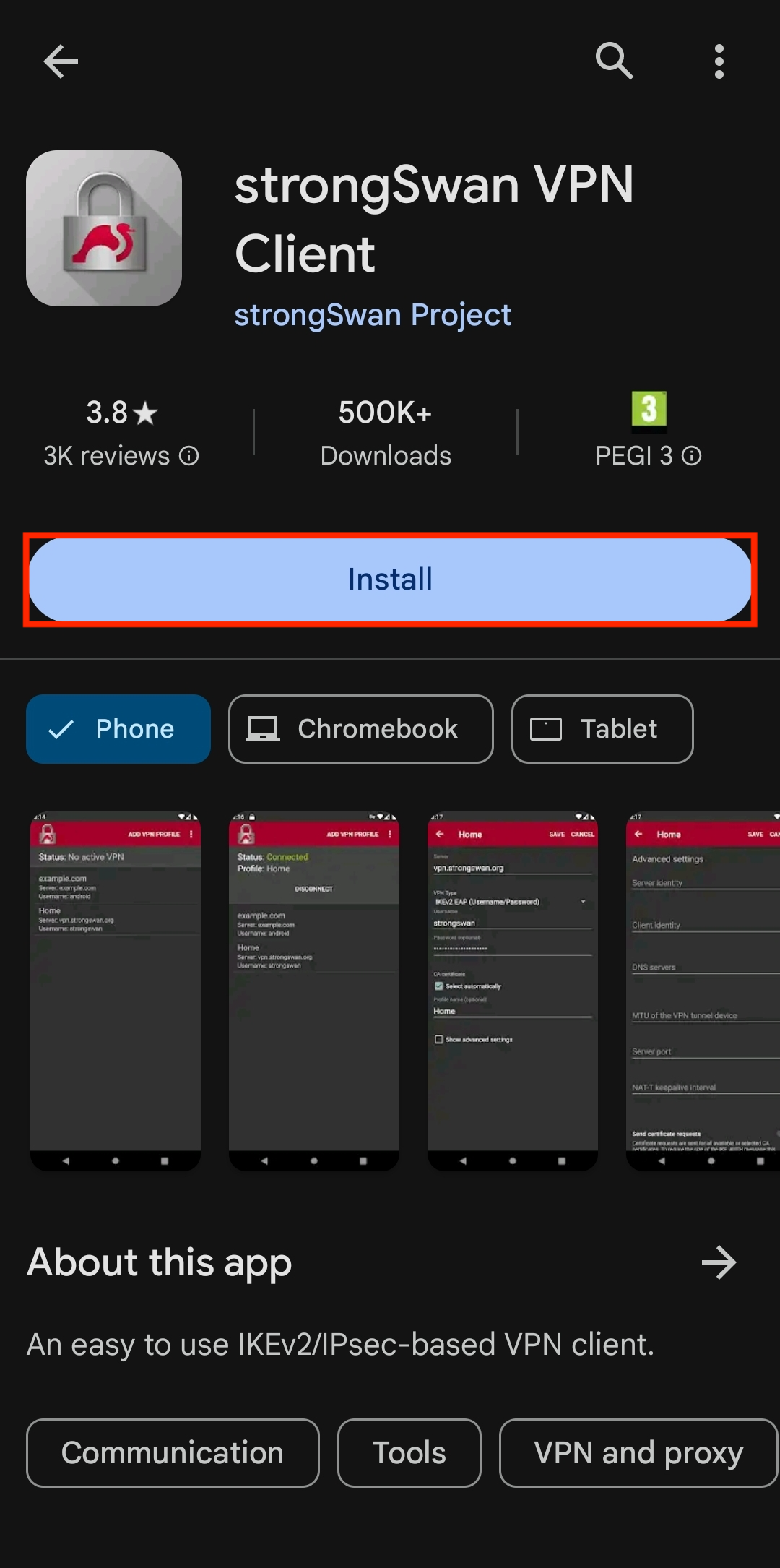 1. Search for the strongSwan VPN Client application on the Play Store. Tap on Install to install the application.