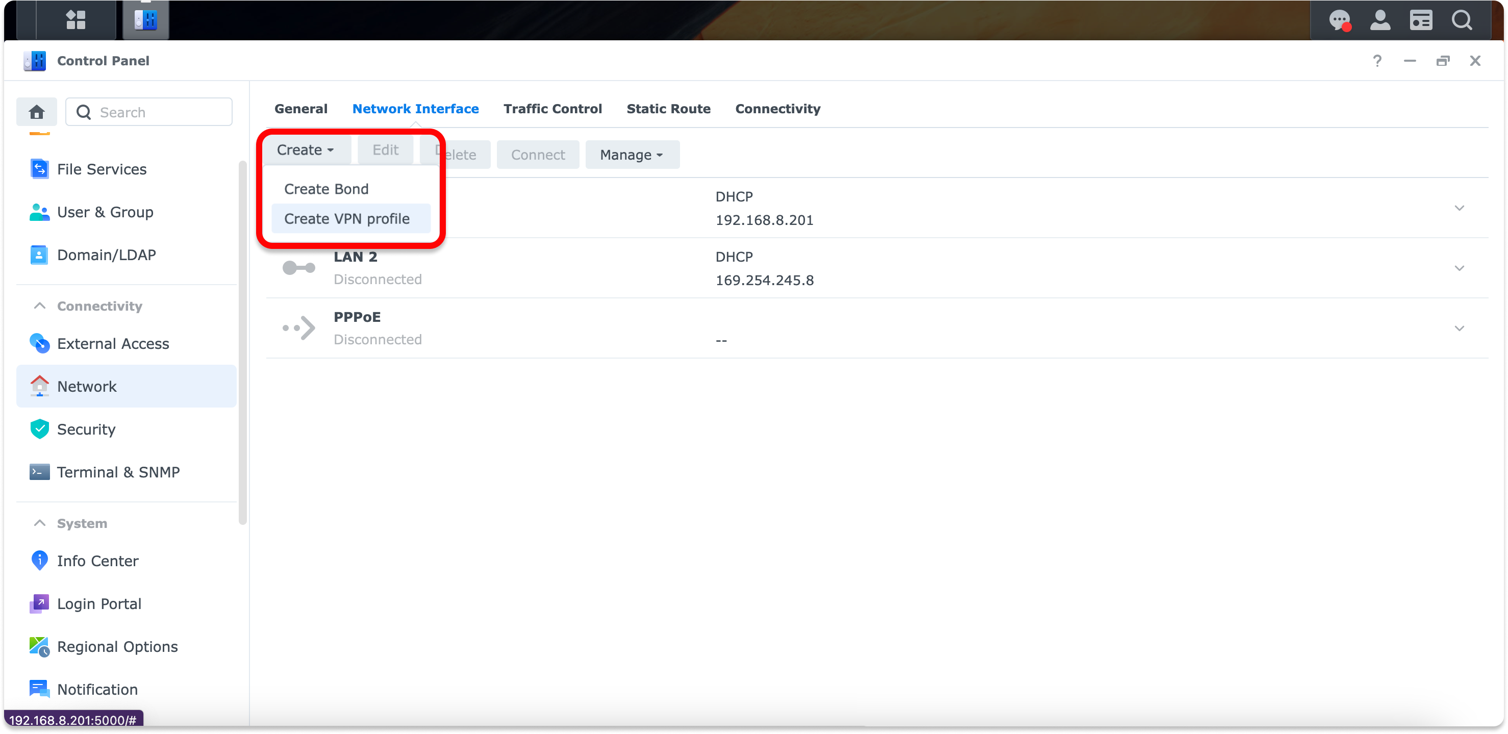 Navigate to Network interface > Create > Create VPN Profile.