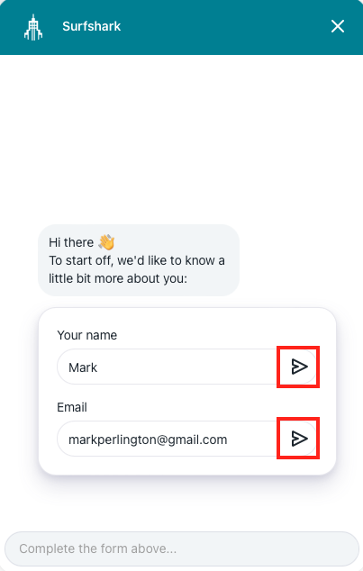 - Fill in your Name and Email fields. Once done, click both of the buttons to confirm the information.