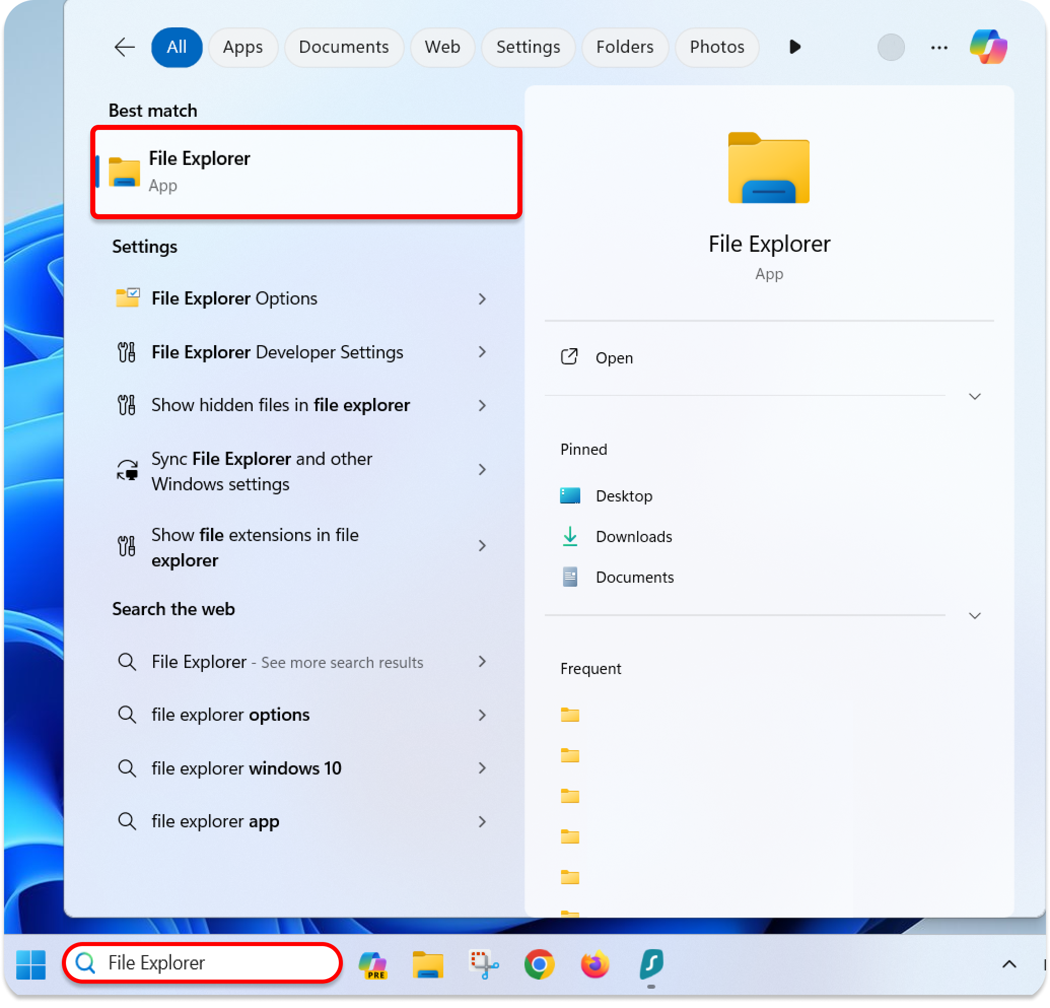 1. Click the Search icon on the Windows start menu and type in File Explorer. Select the first result, which looks like the one in the image below.