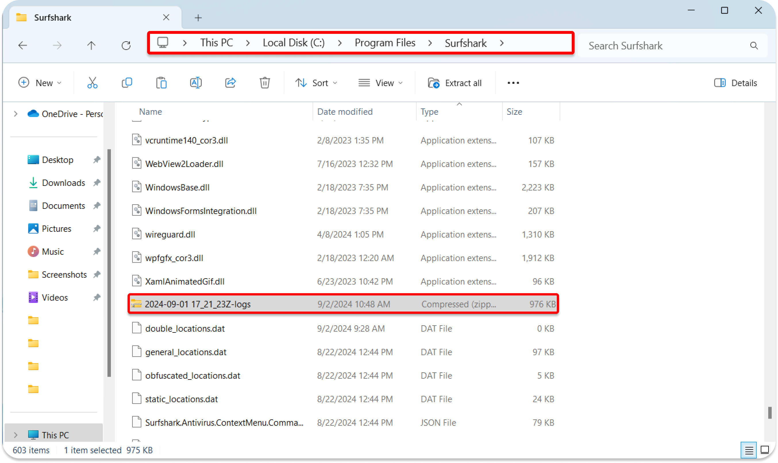 2. Use File Explorer to navigate to your Surfshark installation folder. The default location is This PC > Windows (C:) > Program Files > Surfshark.