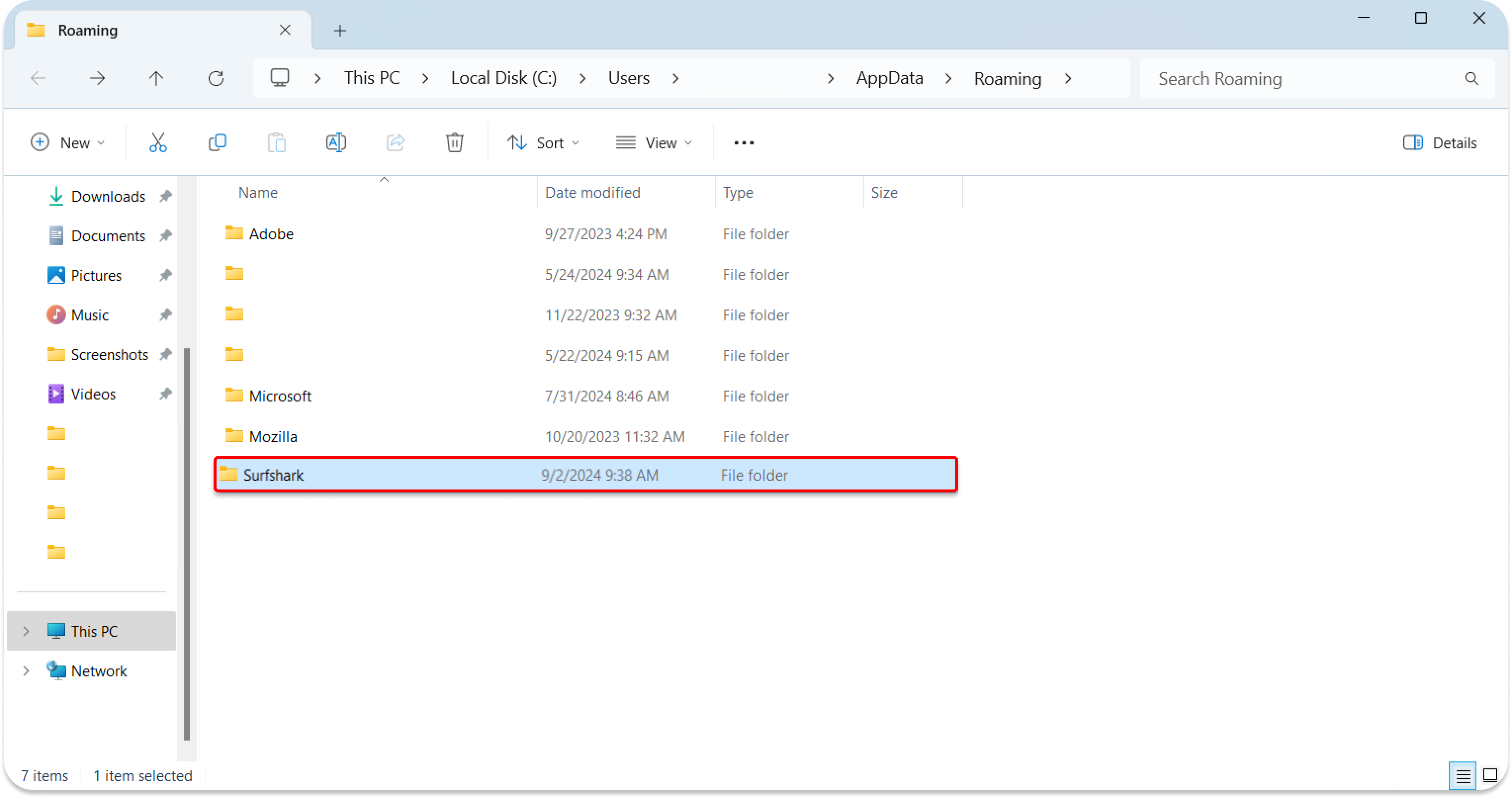 2. This command will open the Roaming folder using File Explorer (%appdata% is a shortcut to this folder). Open the Surfshark folder from here.