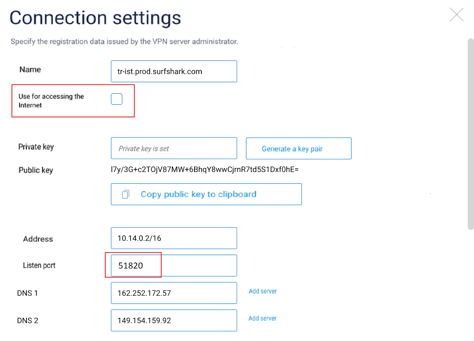 Once there, check the box Use for accessing the Internet. If the listen port is not inserted, input 51820.
