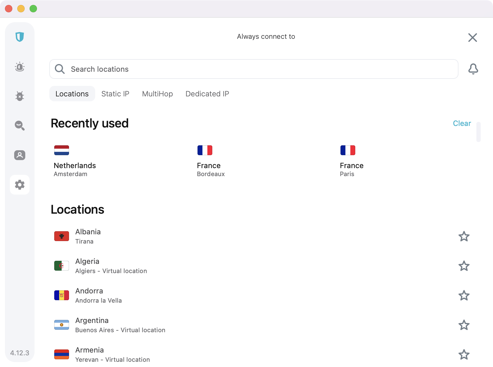 The best part is that you can manually set to which location you want the VPN to connect to automatically. It can be the fastest server, the nearest server, a specific country and city, or even a Static IP or a MultiHop server.