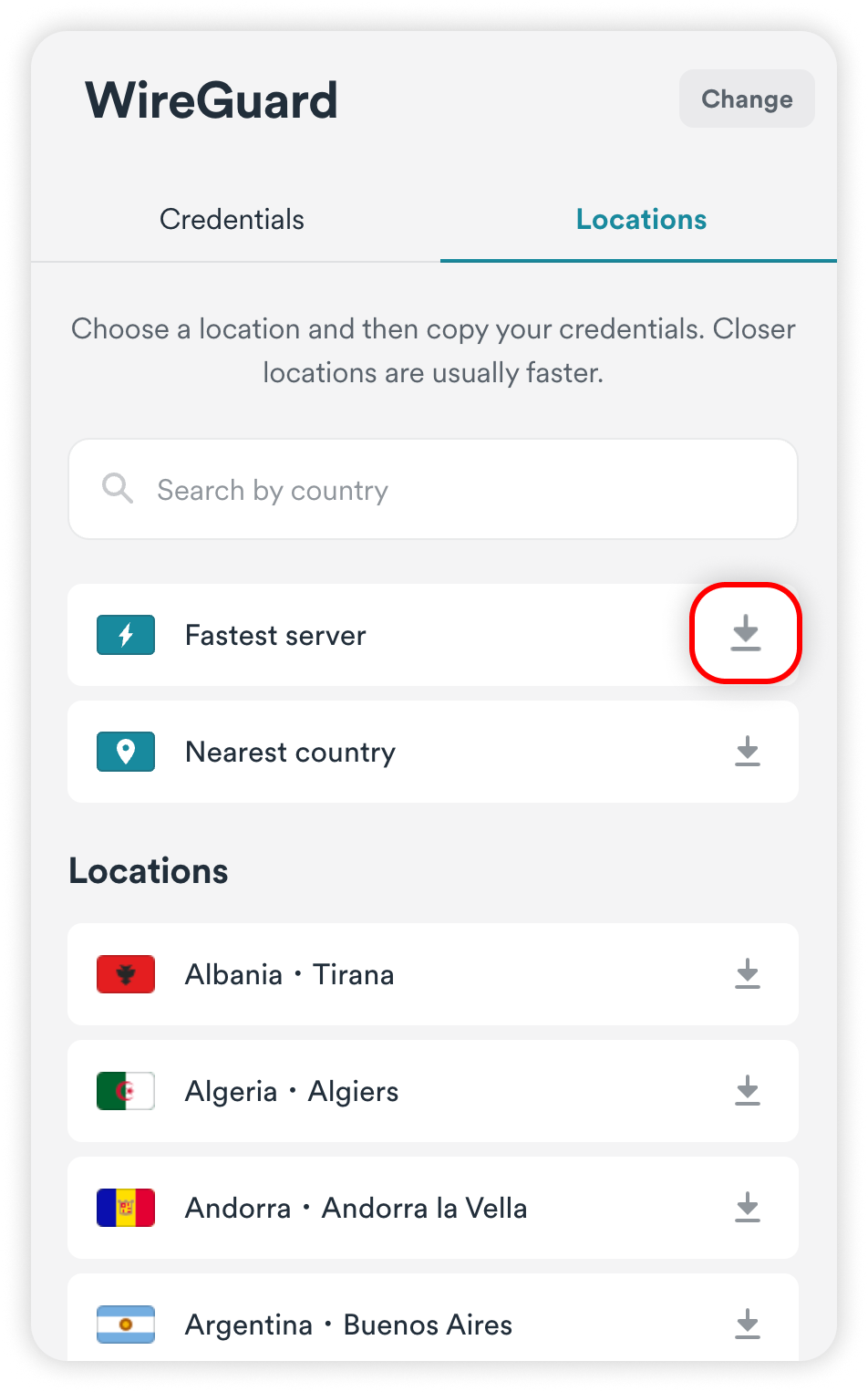 2. Click on the download icon to the right of the server name.