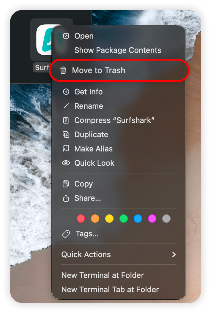 - Locate the Surfshark application, right-click on it, and select Move to Trash: